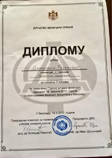 Димитрије Рађеновић, ученик другог разреда гимназије за ученике са са посебним способностима за физику, је учествовао на овом такмичењу. На Државном финалу је освојио трећу награду.